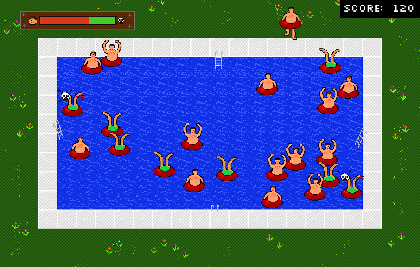 As soon as a swimmer starts to wave at you, snip him to a ladder. Click on him and drag the force line into the opposite direction of where you want him to go. The longer the line, the more force is applied.